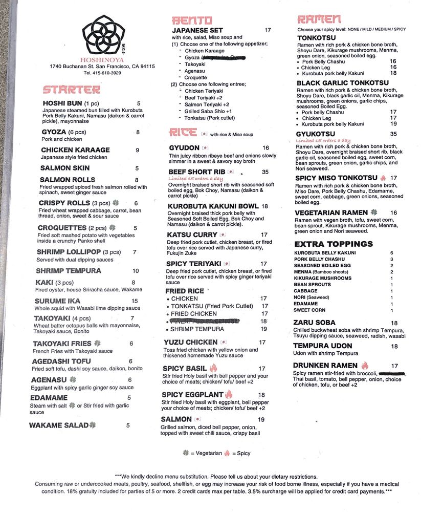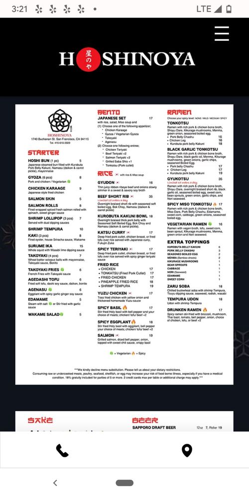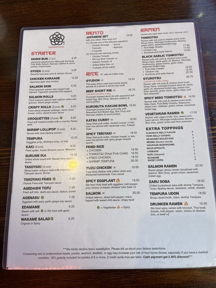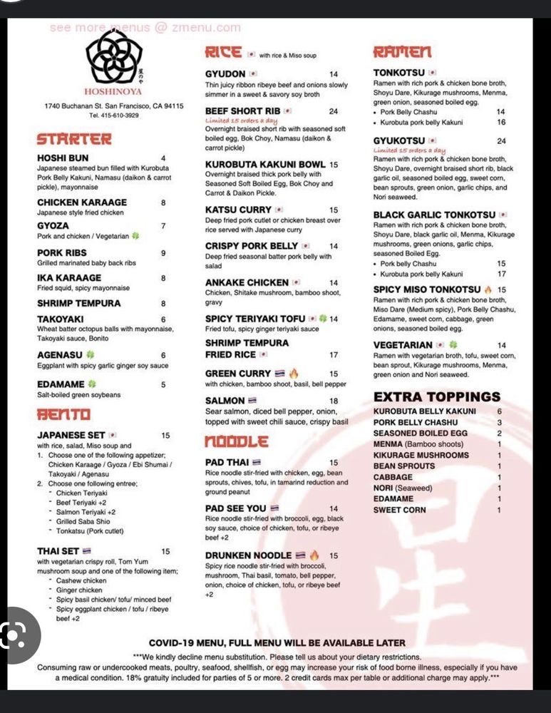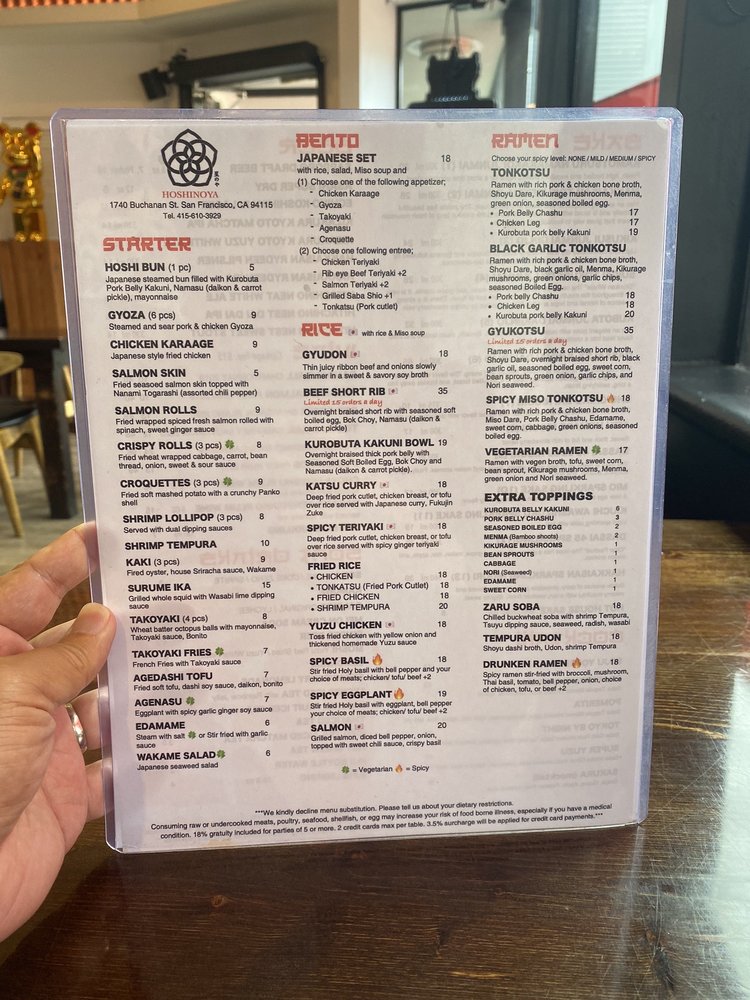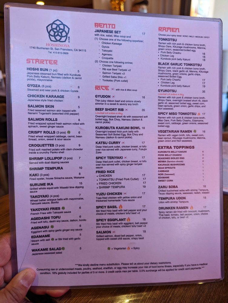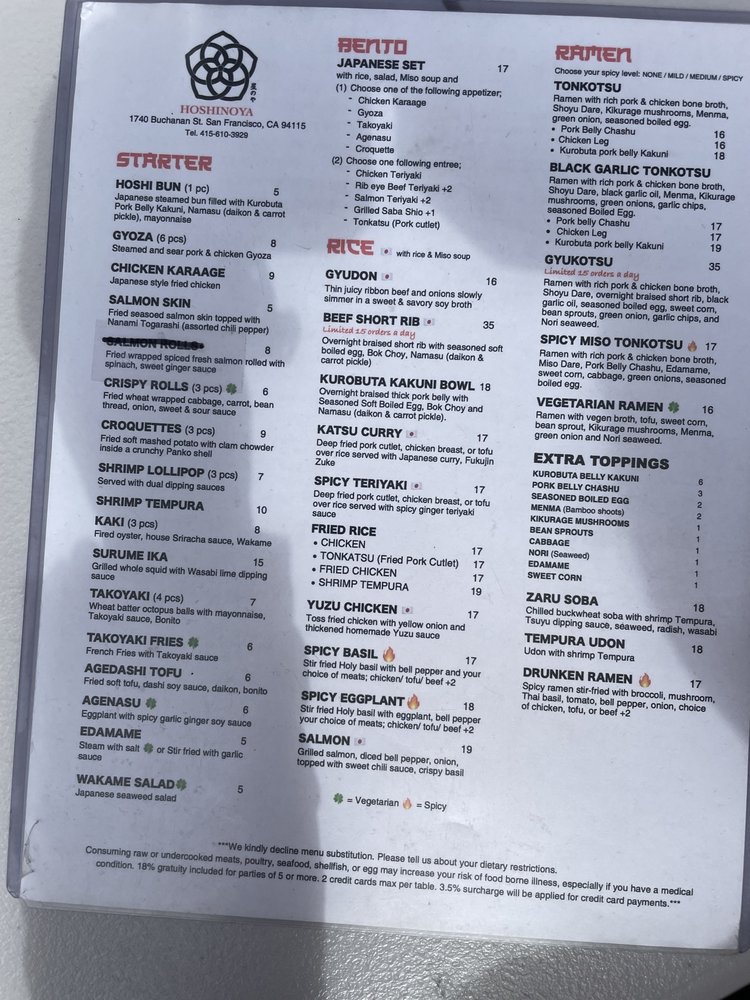 Introducing Hoshinoya, a Japanese restaurant located in San Francisco, CA. Known for its diverse menu offerings, Hoshinoya provides a range of options catering to different dietary preferences. From the flavorful Hoshi Bun and Chicken Karaage starters to the rich and satisfying Kakuni Bowl and Katsu Curry dishes, each item is carefully crafted with attention to detail. Customers praise the tender meat, well-balanced flavors, and generous portion sizes. The restaurant's clean and trendy ambiance adds to the dining experience, making it a popular choice for groups and individuals alike. Whether you're looking for a quick bite or a full meal, Hoshinoya offers a selection that is sure to satisfy your cravings.